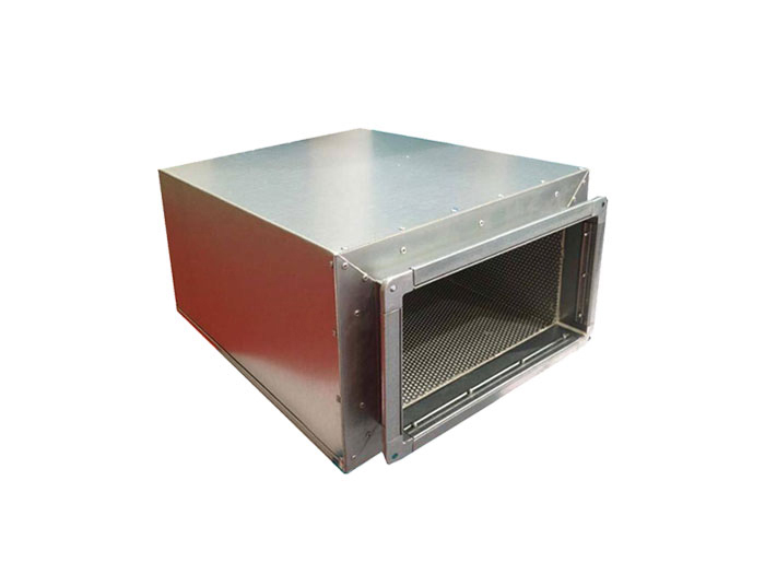 消聲降噪靜壓箱包括靜壓箱本體,靜壓箱本體的上表面和靜壓箱本體的底面均開設有通口,靜壓箱本體的內(nèi)側壁通過銷軸鉸接有兩組等距離排列的消聲片,兩組消聲片相互靠近的一側面均固定連接有松緊帶,靜壓箱本體的內(nèi)側壁固定連接有定位板,定位板的上表面固定連接有兩個吸音棉,兩個吸音棉相互遠離的一側面均與靜壓箱本體的內(nèi)側壁固定連接,定位板的上表面固定連接有彎板,靜壓箱本體的內(nèi)側壁固定連接有蜂窩板,蜂窩板的下方設有過濾網(wǎng),定位板的上表面開設有四個通風口。